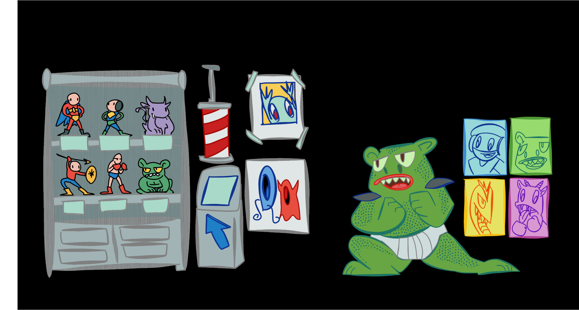 character design, storyboarding, dinamic and static assets for 2D animation.